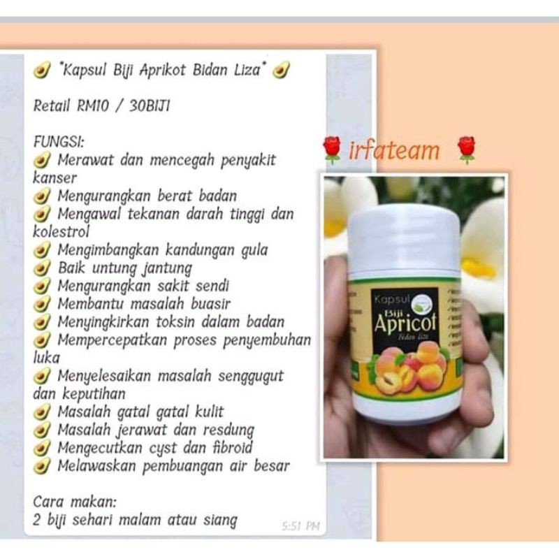 Memang benar biji aprikot sememangnya pahit bila dikunyah. Menurut banyak sumber, jika seseorang yang ingin mencegah daripada mendapat kanser, … Bermula dari pukul 4 pagi, 8 pagi, 12 tengahari, 4 petang, 8 malam dan 12 tengahmalam. Vitaminnya tidak hilang sama sekali kerana hanya dikisar dan dikapsulkan sahaja. Di kunyah 65 kali kunyahan sehingga sebati dengan air liur.